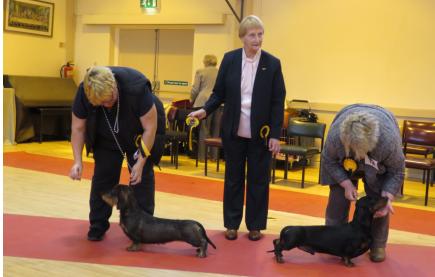 1 Hutton Dachalune Araxia Red bitch, very elegant with a good length of neck correct shoulder, good length of ribbing and a good level topline, tail set a bit low 2Hutton Dachalune Abella Black & Tan bitch litter sister to 1 not quite the same presence of 1 and a bit narrower on front.